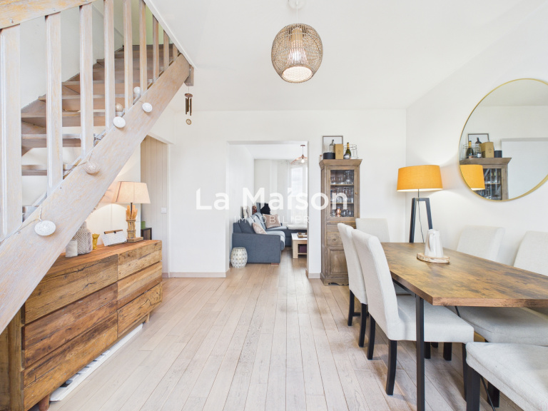 Une entrée, un cellier/buanderie pratique, une cuisine équipée, un espace salon/séjour de 26m2, traversant et baigné de lumière avec sa double exposition. En duplex, vous retrouverez deux chambres spacieuses, une salle d'eau avec WC moderne.