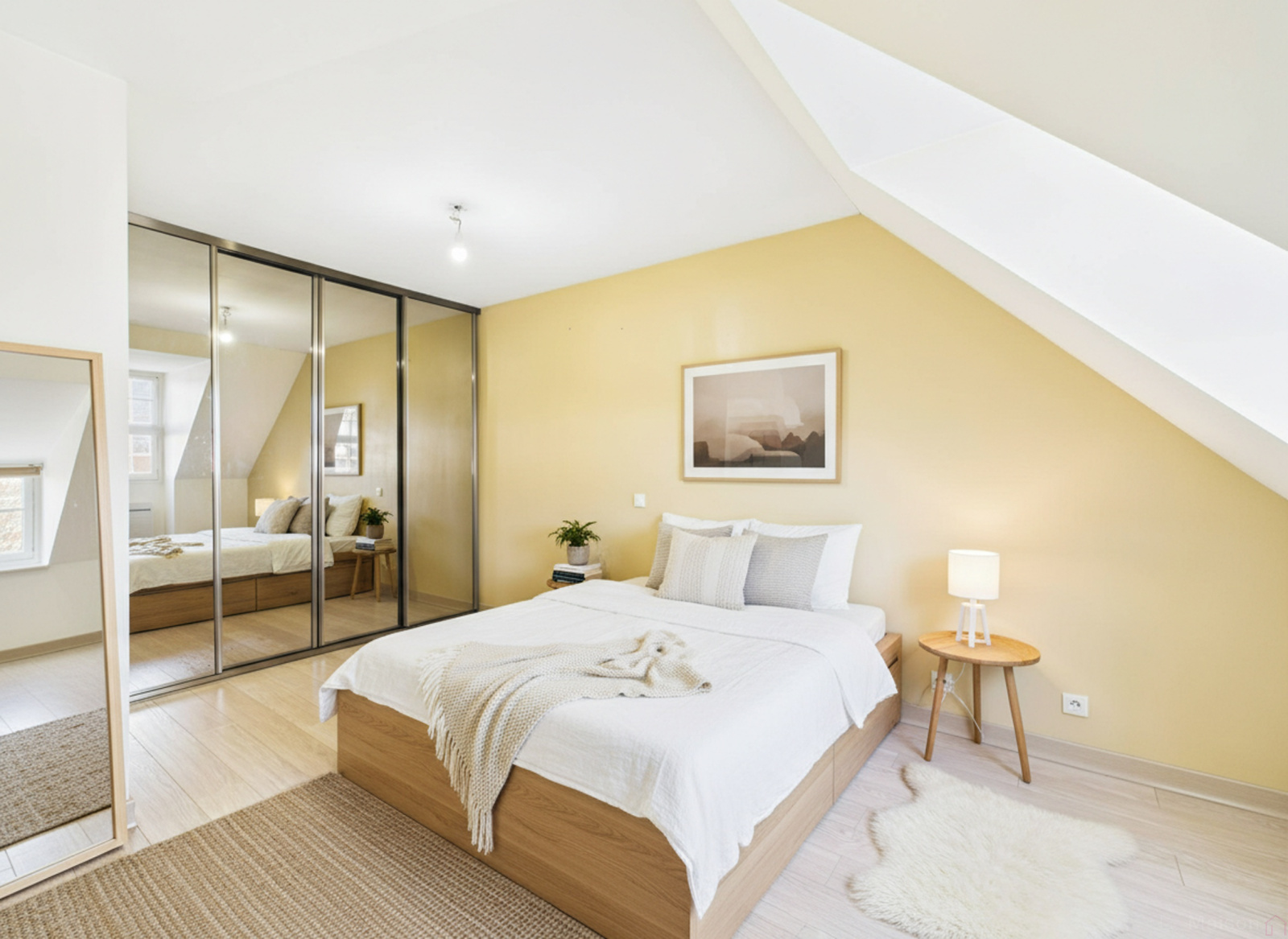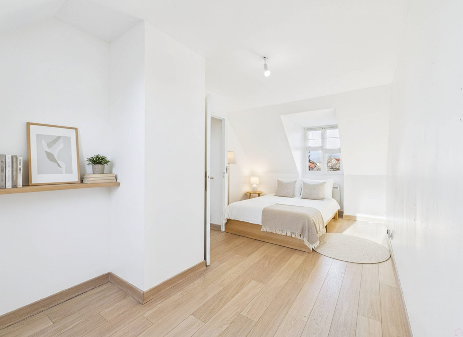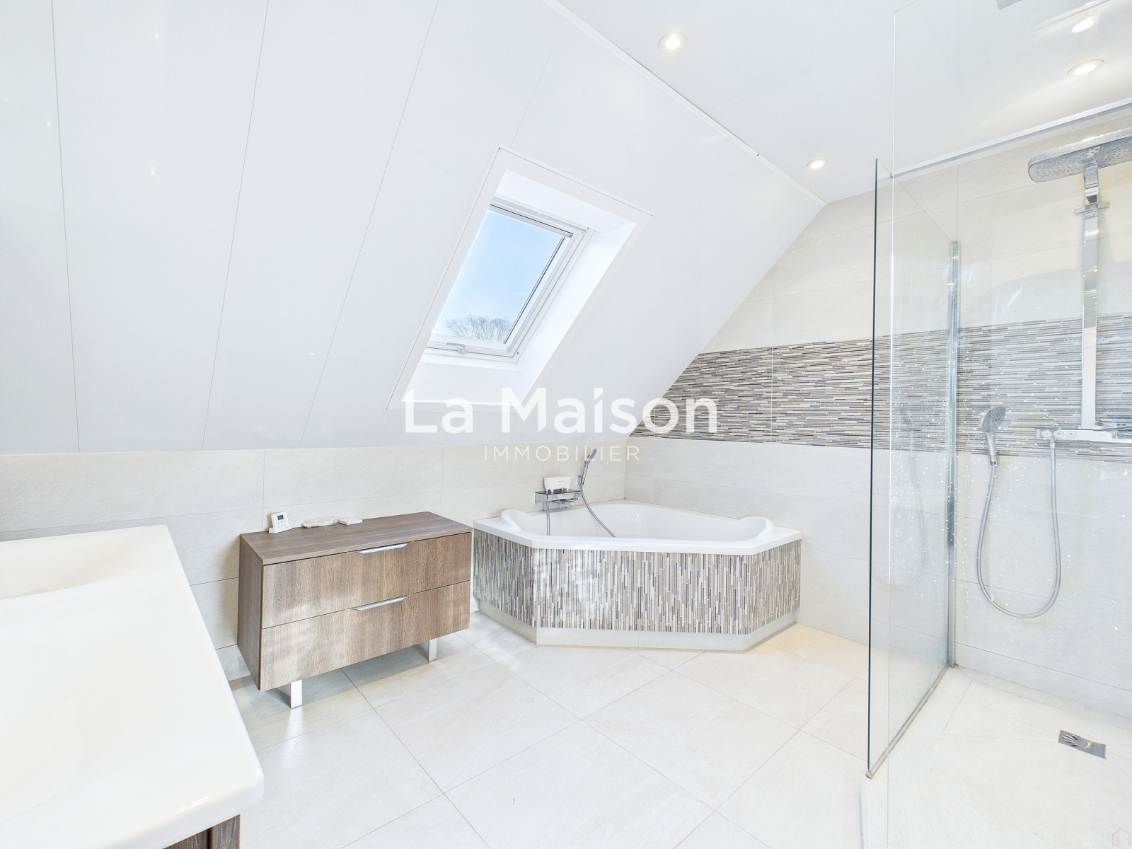 A l'étage, le palier dessert 2 chambres spacieuses, une salle de bains moderne et parfaite pour une famille.