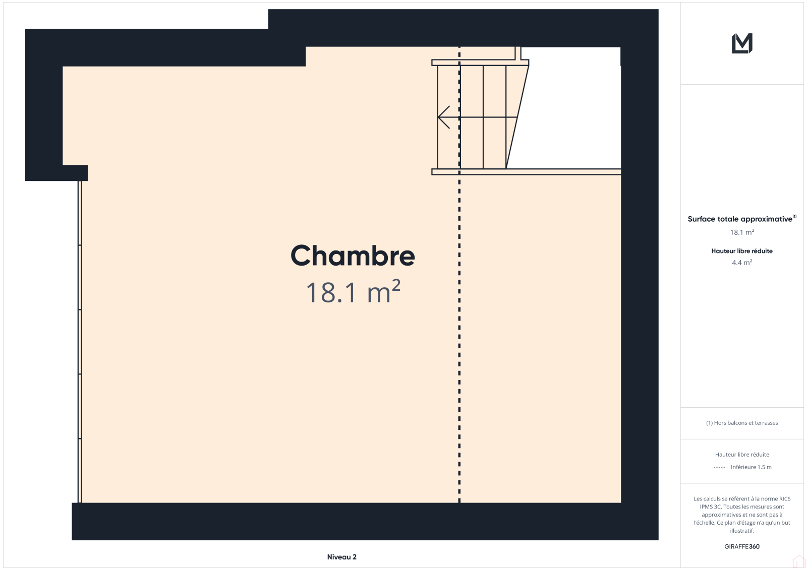 A l'étage sur une dalle en béton : Un palier donnant sur une chambre avec sa propre terrasse ainsi qu'une salle d'eau avec douche à l'italienne et WC.