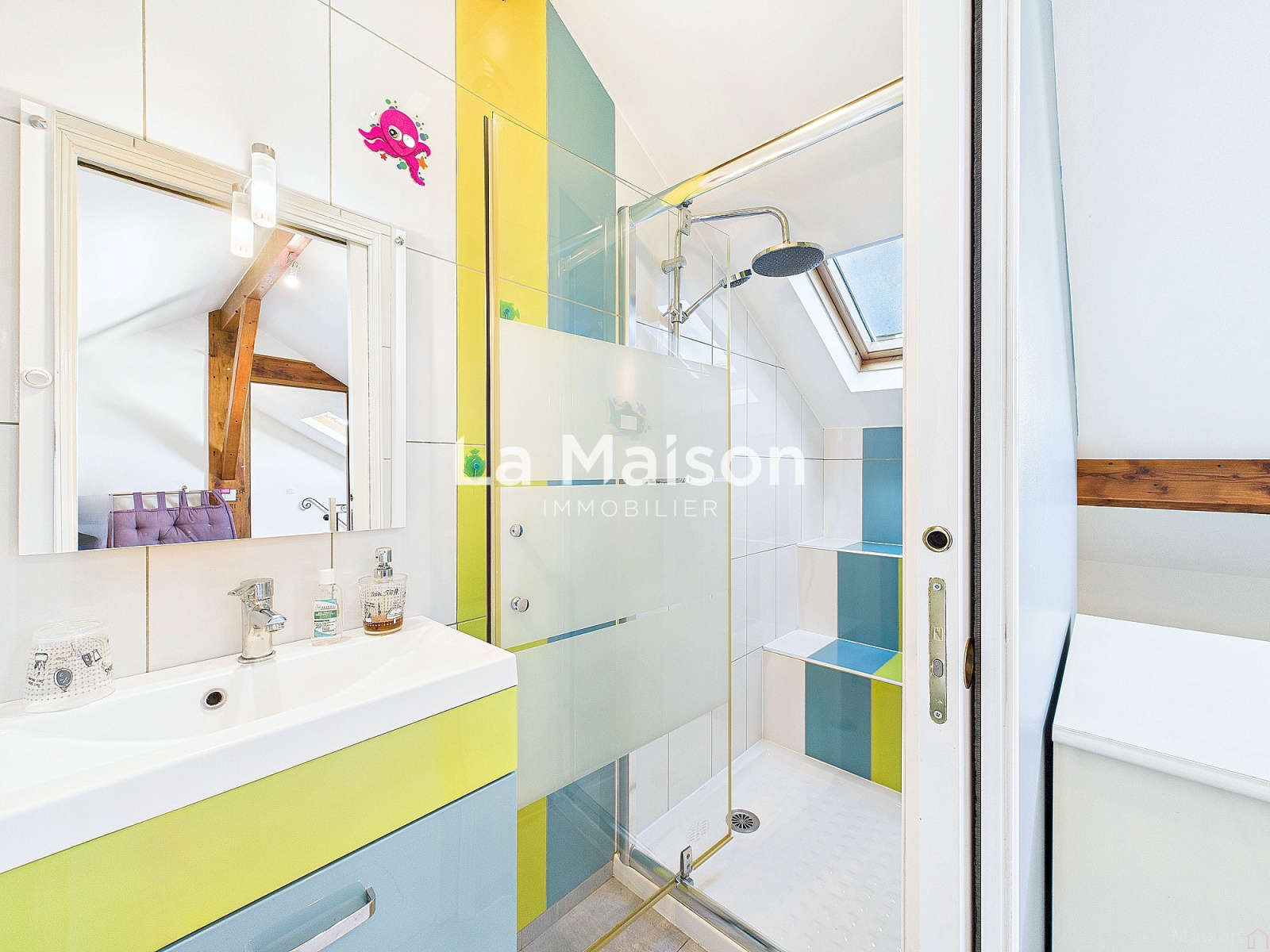 Au rez-de-chaussée surélevé, vous découvrirez une entrée menant à un salon-salle à manger traversant, une cuisine ouverte, une chambre ainsi qu’une salle d’eau avec WC. À l’étage, les combles ont été parfaitement aménagés en deux chambres, dont une en enfilade, et une salle d’eau avec WC.