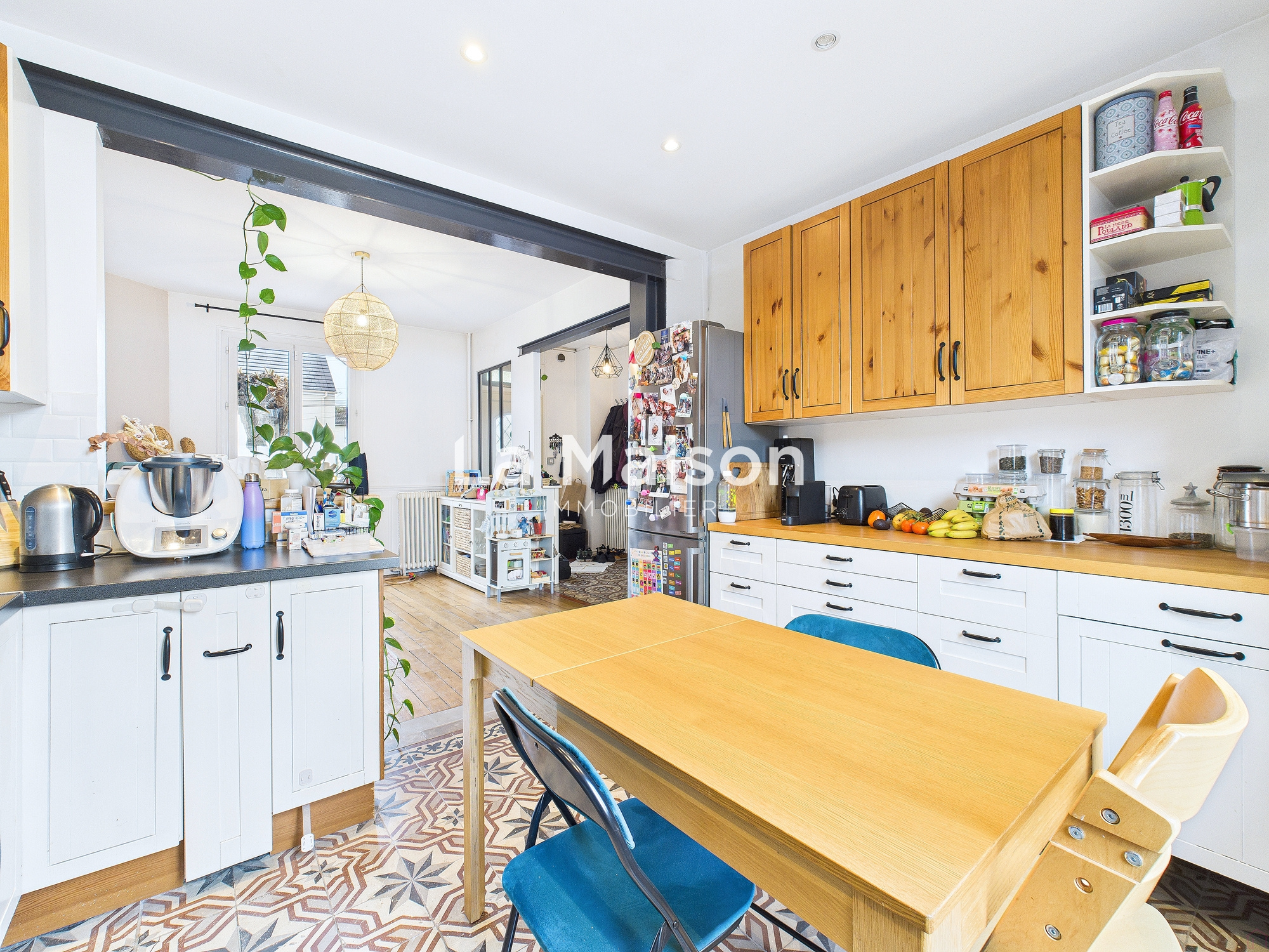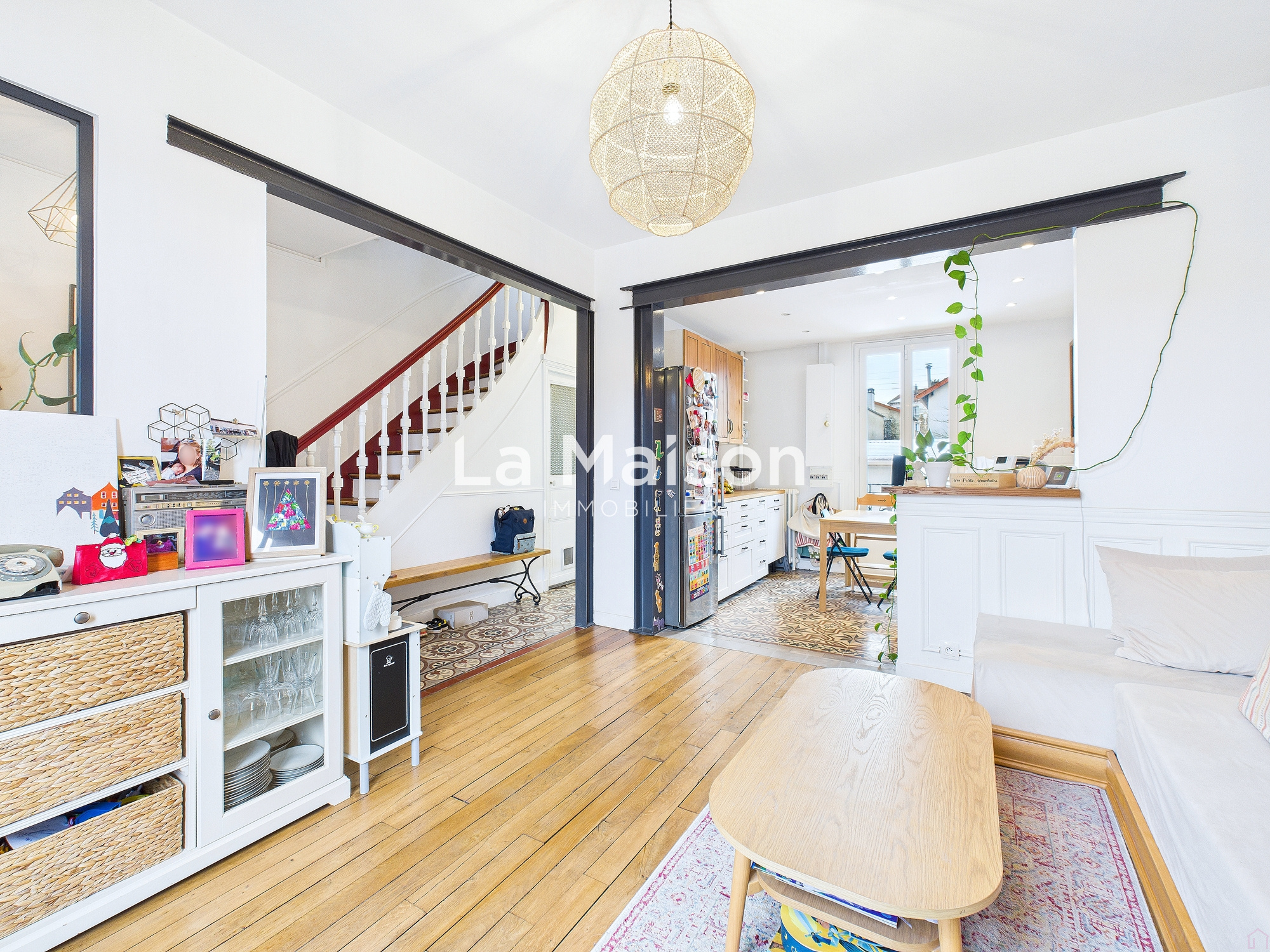 Au rez-de-chaussée, vous découvrirez une entrée avec carreaux de ciment, un séjour ouvert sur la cuisine, ainsi qu’un WC séparé.