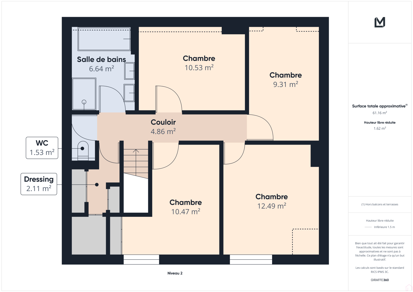 Au 1er étage, sur une dalle en béton, vous découvrirez un couloir donnant sur 4 belles chambres, une salle de bains avec douche rénovée il y a 2 ans ainsi qu'un wc et une pièce dressing.