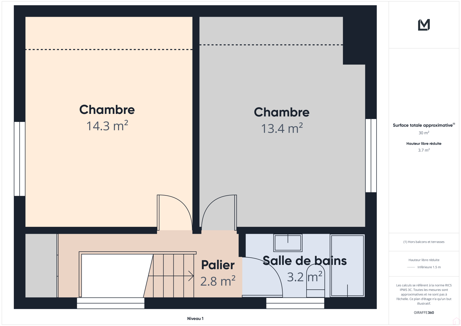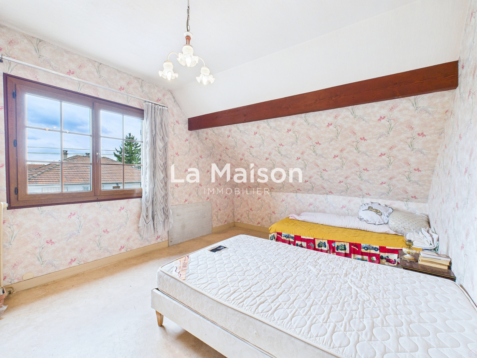 Au premier étage : le palier dessert deux chambres de bonne tailles, une salle de bains avec WC.