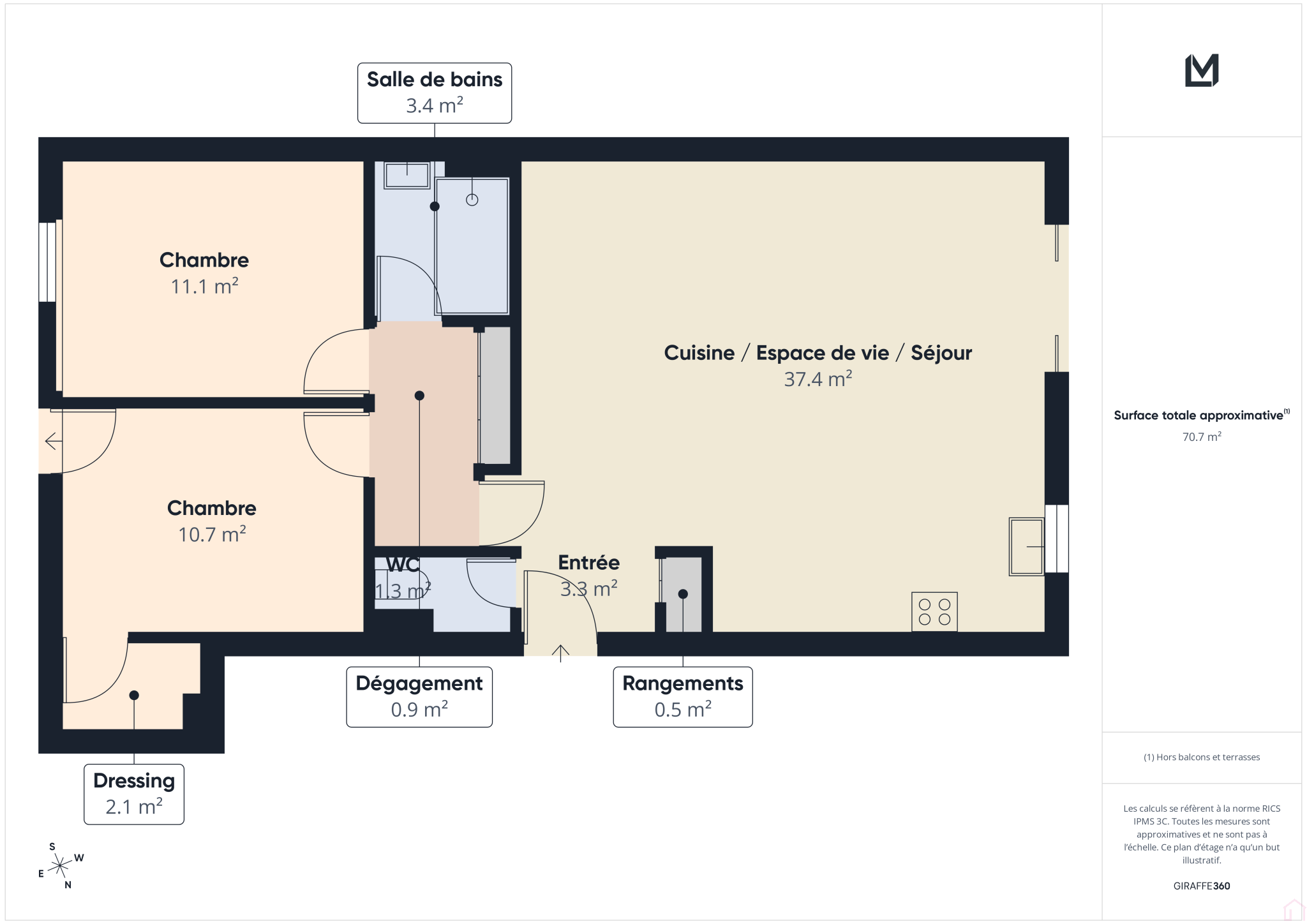 Cet appartement de 71m² est au 1er étage d'une belle résidence, il dispose d'une entrée avec rangements, un magnifique salon-salle à manger avec une cuisine ouverte aménagée, le tout donnant sur une terrasse. On retrouve également deux chambres avec dressing, une salle d'eau et un wc. Un deuxième balcon filant complète ce bien.