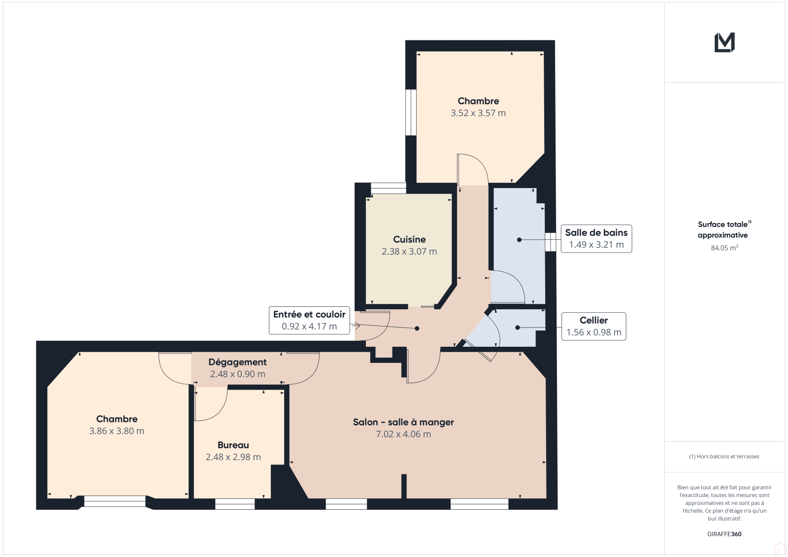 Cet appartement vous offre une entrée, un double salon-salle à manger baigné de lumière (28 m2), une cuisine aménagée, deux chambres, une bureau de 7m2 (ou petite chambre pour enfant), une salle d'eau avec wc, et un cellier.