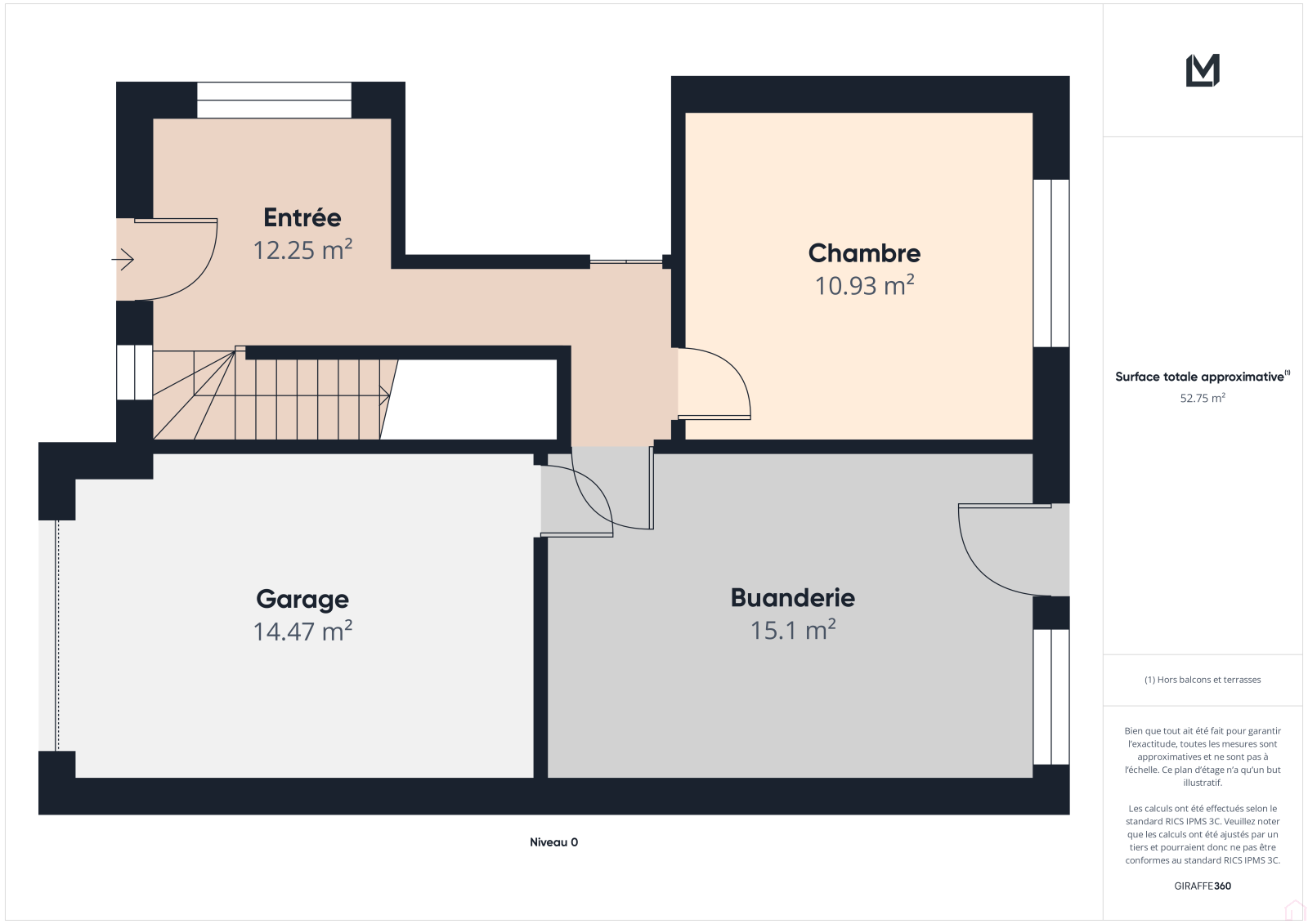 Rez-de-jardin : entrée, chambre, WC avec chaufferie, buanderie et garage.