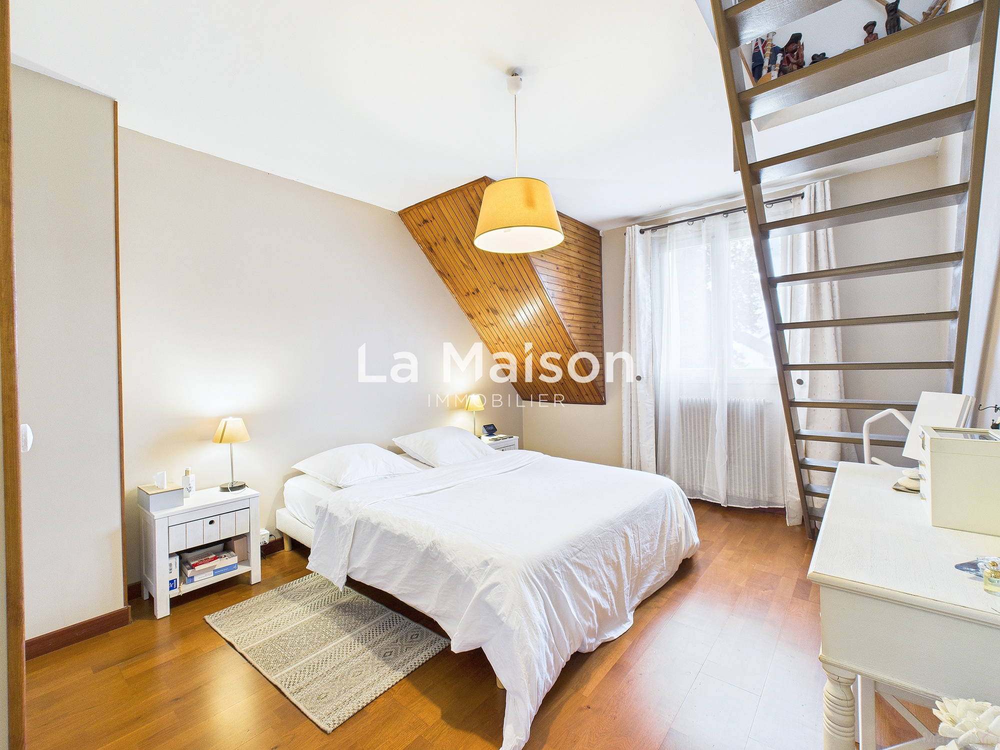 Cette maison familiale de 90m2, édifiée sur sous-sol total, comprend un garage, un chaufferie-buanderie et un cellier. Au rez-de-chaussée surélevé vous trouverez : Une entrée avec placard, un séjour-salon de 30m2 avec cheminée donnant sur une superbe terrasse, une cuisine US aménagée et un WC indépendant. A l'étage, un palier dessert trois chambres et une salle d'eau avec WC. Les combles sont aménagés en coin bureau et rangements.